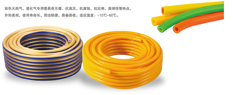彩色天然氣、液化氣專用管具有無毒、抗高壓、抗腐蝕、抗拉伸、高彈性等特點,外形美觀,使用壽命長,簡潔輕便,易卷易收。適應溫度: -109- -60C。